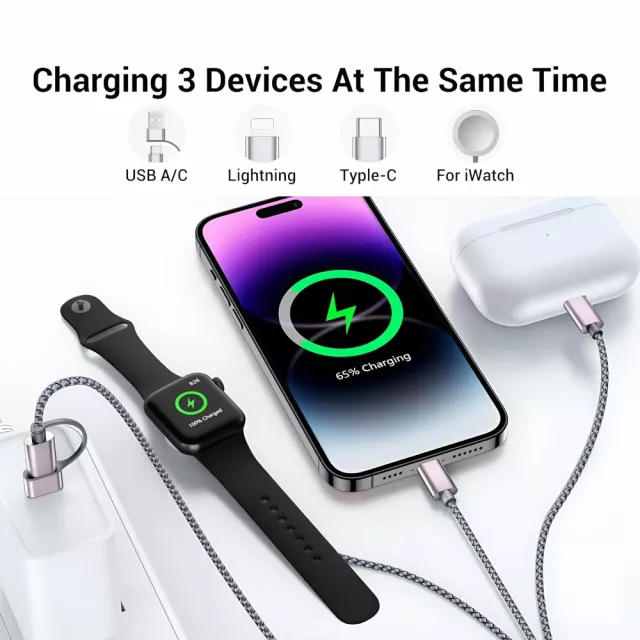 Say goodbye to tangled cables and multiple chargers! The 3-in-2 Multi Charging Cable is designed for those who want simplicity, versatility, and reliability in one product. Whether you’re charging your Apple Watch, iPhone, or iPad, this all-in-one solution makes it easier than ever to stay connected while on the go. Don’t let low battery slow you down—order yours today and make this essential travel companion a part of your daily routine!