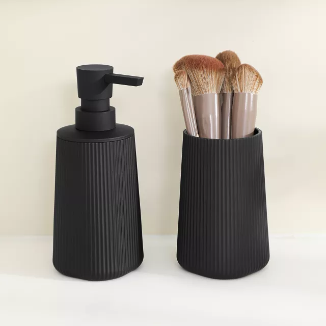Transform your bathroom into a modern sanctuary with the Matte Black Striped Bathroom Accessory Set. This two-piece set, featuring a soap dispenser and a toothbrush holder, offers the perfect balance of functionality and elegance. Crafted with attention to detail, these pieces will elevate your bathroom décor while keeping your essentials organized and easily accessible.